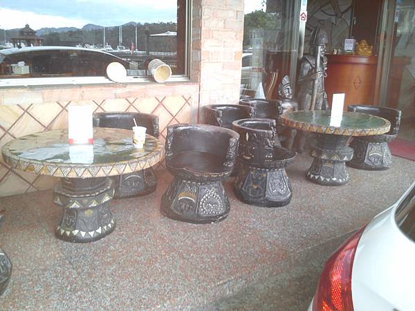 餐廳外面放了兩個石桌含石椅..孩子上去休息了..