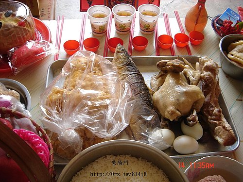 所有東西的擺放都有一定的規矩,牲禮一定要放在最中間,酒杯以及清茶要放在前面,水果通常放在左邊,飯可以放在中間或者右邊,其他祭品則隨意擺放。